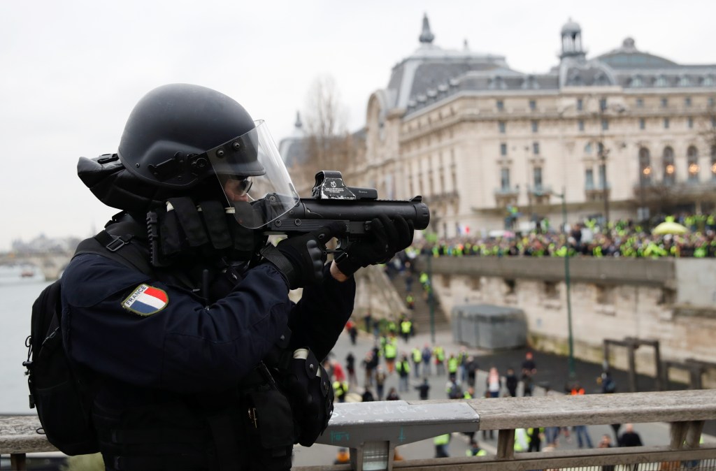 French-invented “flash balls” have been used by riot police in the country since before the “yellow vest” protests began in 2018 over rising fuel prices and other economic grievances. They are made of rubber or condensed foam. While the original flash balls emitted a flash, the ones in use today do not. They travel at a higher velocity than other non-lethal projectiles like rubber bullets or pepper balls. A recent model of flash ball gun, known as the LBD40, fires 40mm projectiles traveling at speeds of up to 100 meters (328 feet) per second.