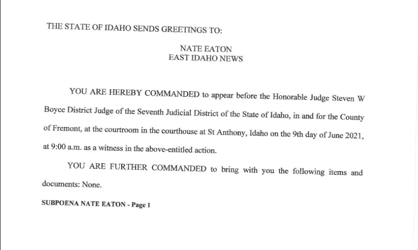 Yesterday, Nate Eaton, the news director at the local website EastIdahoNews.com, posted on Twitter an image of a subpoena ordering him to appear in a local county court on June 9 to give witness testimony in a conspiracy case he has covered extensively, relating to the deaths of two children. John Prior, an attorney representing the defendants in the case, filed the subpoena and the county’s deputy clerk signed it, according to the document on the website of the Idaho judiciary.