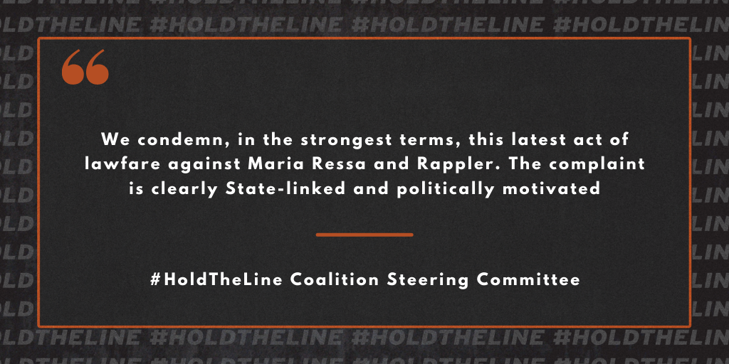 “We condemn, in the strongest terms, this latest act of lawfare against Maria Ressa and Rappler. The complaint is clearly State-linked and politically motivated, and we hope the prosecutor chooses not to escalate this complaint to yet another criminal libel charge against Ressa and her colleagues,” the Hold the Line Coalition Steering Committee said. Ressa continues to fight seven existing legal cases brought by the State, including an appeal against her 2020 conviction for criminal cyber libel, which could see her jailed for up to six years.