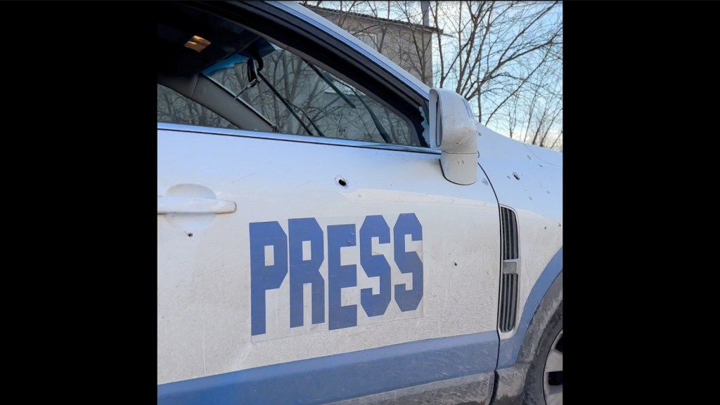 “That a car clearly marked ‘press’ could have been deliberately targeted is simply unacceptable. Journalists are civilians under international humanitarian law and should be protected as such,” said Gulnoza Said, CPJ’s Europe and Central Asia program coordinator, in New York. “Russian and Ukrainian authorities should promptly investigate the attack that resulted in the injury of journalist Claudio Locatelli, which could have easily had a much more dramatic conclusion.”