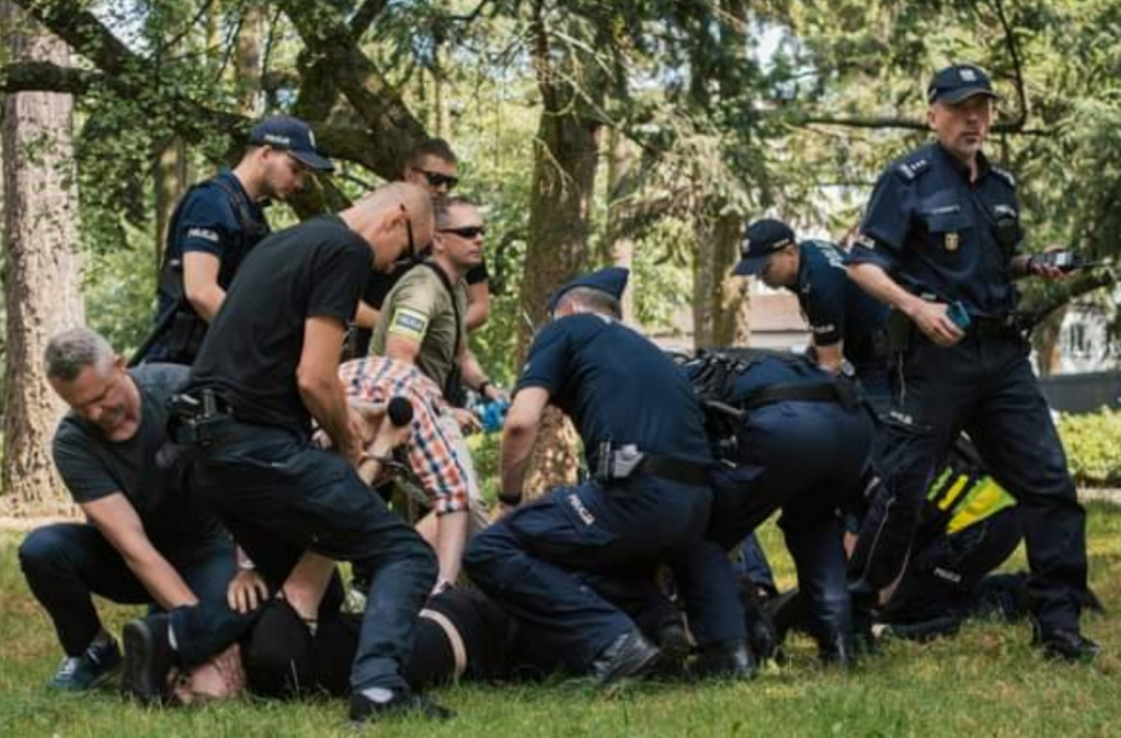 Piasecki can be heard saying that he wants to continue covering the events, according to an OKO.press transcript. Police then pushed him aside, and the video shows the police officer grabbing his neck from behind and dragging him toward the ground. Piasecki told CPJ and local media that he did not resist and was not injured, but the officer broke his own leg as they fell to the ground.