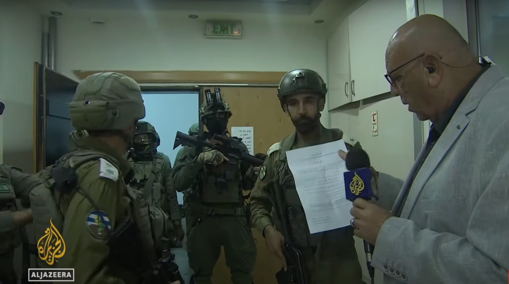 Al Jazeera aired footage of the raid, during which soldiers confiscated documents and equipment from the office. Soldiers seized the microphone from Al Jazeera’s West Bank bureau chief Walid al-Omari while he was live on air with correspondent Givara Budeiri outside the building. Al Jazeera said the forces also removed a poster of Shireen Abu Akleh, a Palestinian American correspondent murdered by Israeli forces in 2022, from the building.