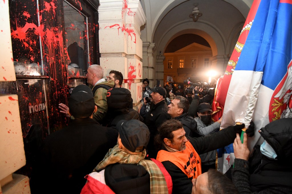The individuals shouted insults at N1 TV reporter Žaklina Tatalović and her cameraperson, Nikola Popović, and another protester struck Popović’s hand, causing him to drop and damage his camera. Later a man hit and knocked Euronews camera operator Mirko Todorović to the ground. No injuries were reported.