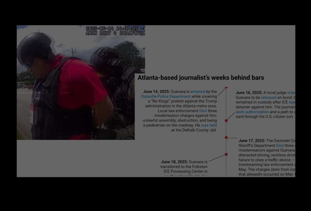 Spanish-language reporter Mario Guevara, who has covered immigrant issues in the Atlanta metro area for the past 20 years, was detained by local law enforcement while livestreaming a local “No Kings” protest in mid-June. He was charged with three misdemeanors and then denied bond when Immigration and Customs Enforcement (ICE) issued a detainer against him, despite being in the country legally at the time of his arrest.