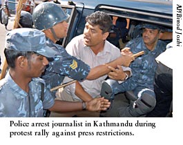 JUNE 8, 2005 Posted: June 9, 2005 Many journalists HARASSED, ATTACKED Riot police in the Nepalese capital, Kathmandu, arrested dozens of journalists who were protesting the government’s emergency press restrictions and proposed media law amendments that are expected to codify and stiffen those constraints. Local sources said police detained as many as 50 journalists, including…