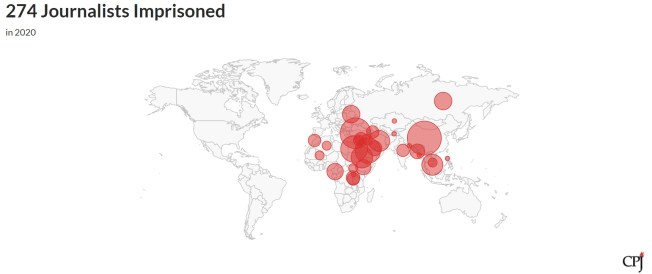 Globally, 320 journalists were imprisoned in connection with their work on December 1, 2023, the second highest recorded since CPJ started recording this data. The previous record was set in 2022, when more than 360 appeared in CPJ’s database.