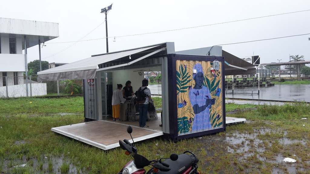 El contenedor se puede instalar prácticamente en cualquier parte. Sus paredes metálicas se doblan y forman toldos para proteger a las personas del sol y de la lluvia. Su interior contiene una pizarra blanca, equipos audiovisuales, ventiladores, una cafetera, mesas portables y sillas plásticas.