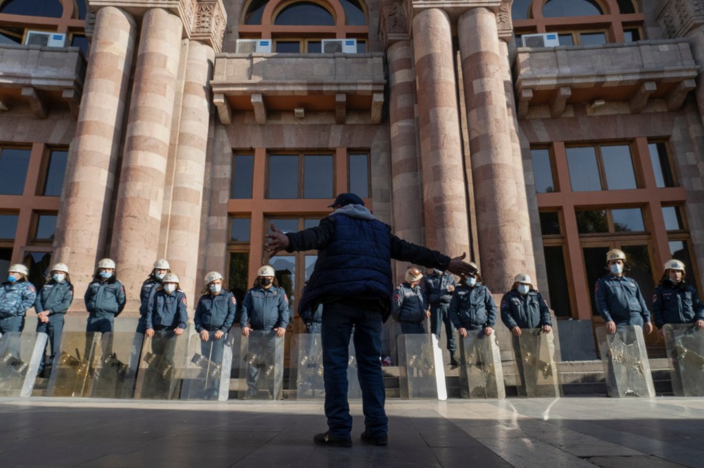 Демонстрант стоит перед армянскими полицейскими у здания парламента в Ереване (Армения), ноябрь 2020 г. (Артем Микрюков/Reuters)