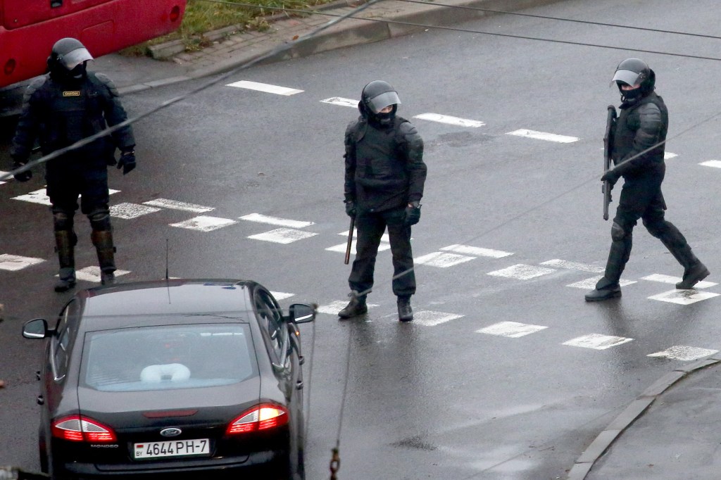 Правоохранители патрулируют улицу в ноябре 2020 года. 6 октября 2022 года суд приговорил трех бывших и действующих сотрудников независимого информационного агентства БелаПАН Андрея Александрова, Дмитрия Новожилова и Ирину Левшину к срокам лишения свободы от 4 до 14 лет по различным обвинениям. (Фото AFP)