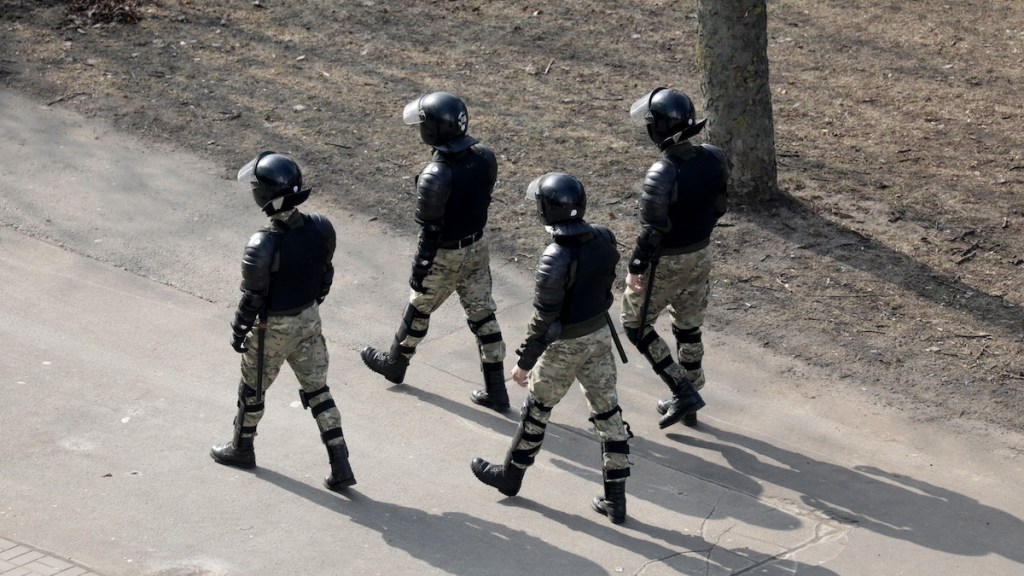 Сотрудники правоохранительных органов Беларуси патрулируют улицу в Минске, 27 марта 2021 года. Недавно власти Беларуси задержали нескольких журналистов, в том числе Александра Зенкова, Алеся Соболевского и Евгения Глушкова. (AFP)