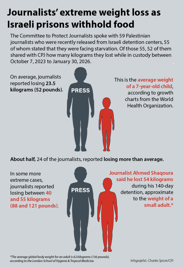 “These are not isolated incidents,” said CPJ Regional Director Sara Qudah. “Across dozens of cases, CPJ documented a recurring set of abuse – from beating to starvation, sexual violence, and medical neglect – directed at journalists because of their work. They expose a deliberate strategy to intimidate and silence journalists, and destroy their ability to bear witness. The continued silence from the international community only enables this.”