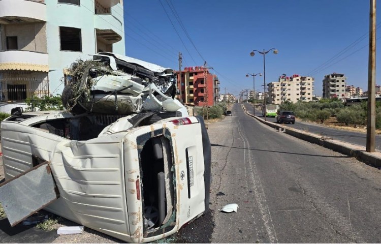 This overturned General Security Forces vehicle in Sweida was struck by an Israeli drone on July 15, 2025, according to journalist Nadim al-Nabulsi.