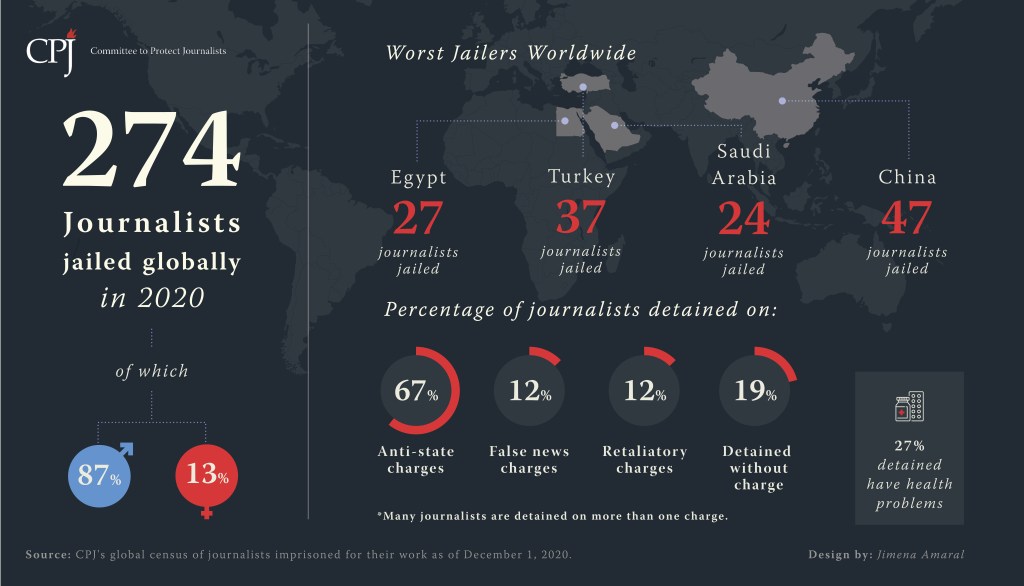 CPJ has found that the number of journalists jailed around the world for their work has hit a new high in 2020, a statistic with dire implications for the future of press freedom.