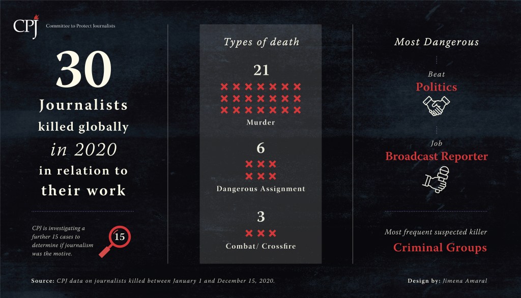 The backdrop to increased murders of journalists in 2020 is CPJ’s research showing that in 8 out of 10 murders, the killers go free. CPJ fights this trend through the Global Campaign Against Impunity. CPJ is also a partner in the newly launched initiative A Safer World For Truth, which pursues justice for murdered journalists and helps keep their stories alive. Find ways to get involved here.