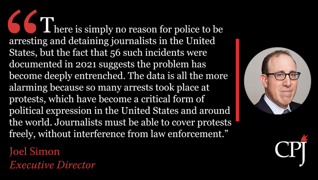 This week, the U.S. Press Freedom Tracker released a new report showing that more than 50 journalists in the U.S. were detained or arrested in 2021. While the numbers are lower than last year’s record, the 56 detained this year nearly equals the total number of arrests in 2017, 2018, and 2019 combined, a deeply concerning sign for press freedom.