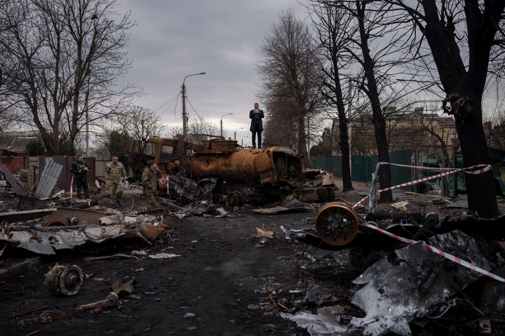 A journalist stands atop a destroyed vehicle after fighting between Russian and Ukrainian forces in Bucha, on the outskirts of Kyiv, Ukraine, on April 6, 2022. (AP Photo/Felipe Dana)