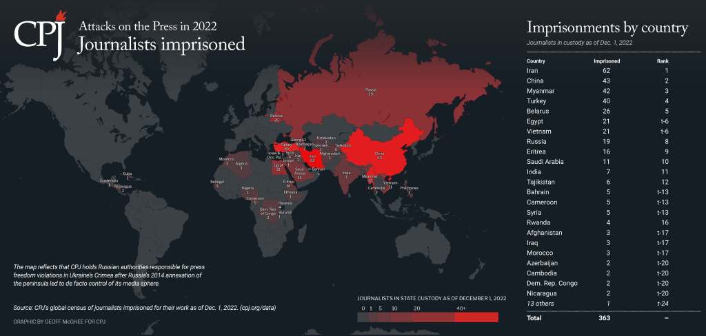 The number of journalists jailed around the world set yet another record this year, with 363 imprisoned as of December 1, 2022, according to CPJ’s 2022 prison census.