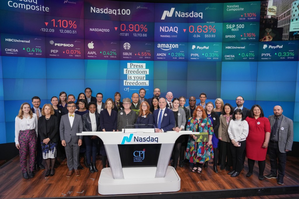 CPJ rang the opening bell at the Nasdaq MarketSite in Times Square in recognition of the 30th anniversary of World Press Freedom Day. The bell ringing ceremony included a speech by CPJ President Jodie Ginsberg, in which she called for the immediate release of Evan Gershkovich, the Wall Street Journal reporter wrongfully detained in Russia, and underscored the urgent need to stand with journalists whose reporting will not be silenced even if they are behind bars.